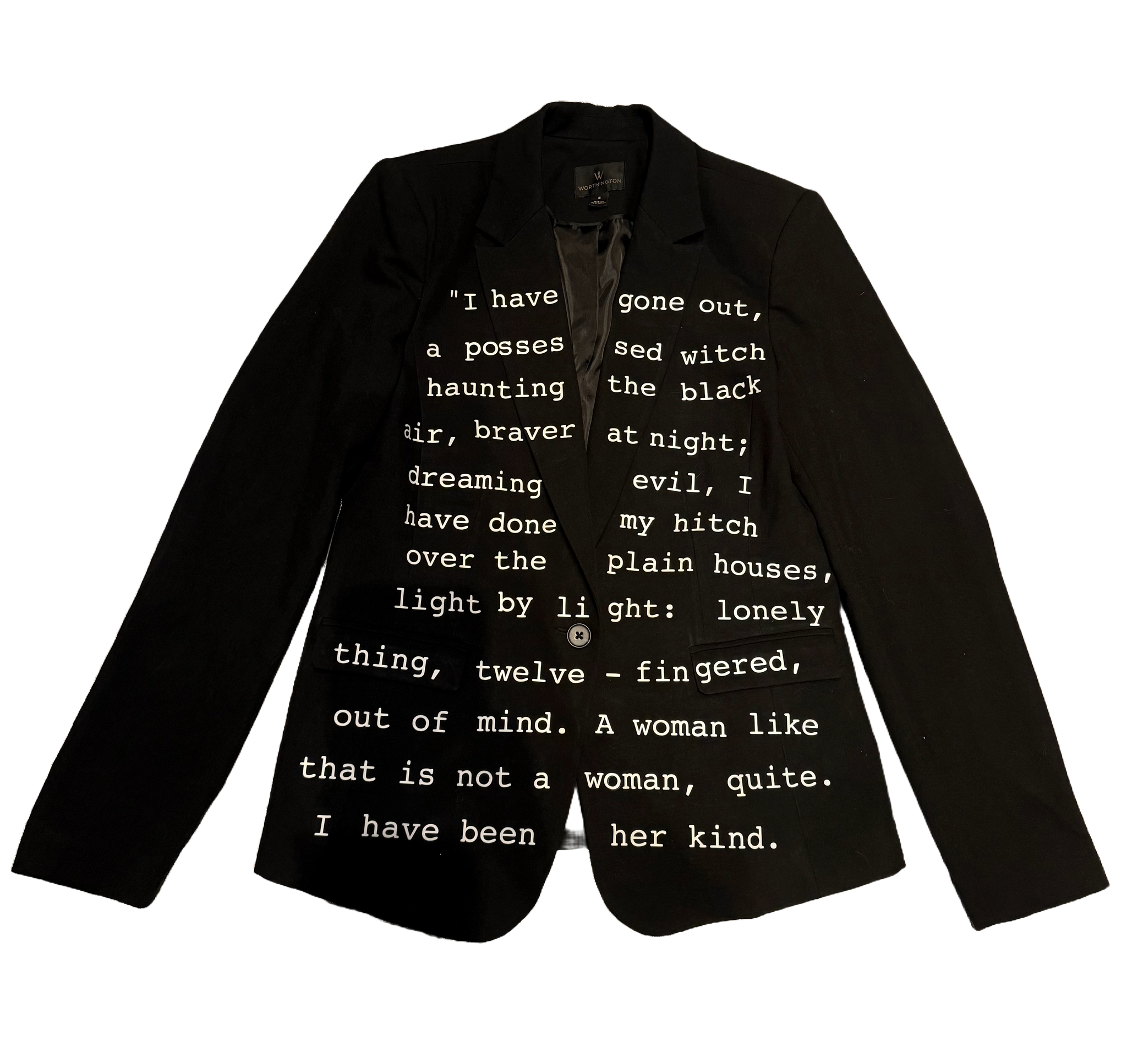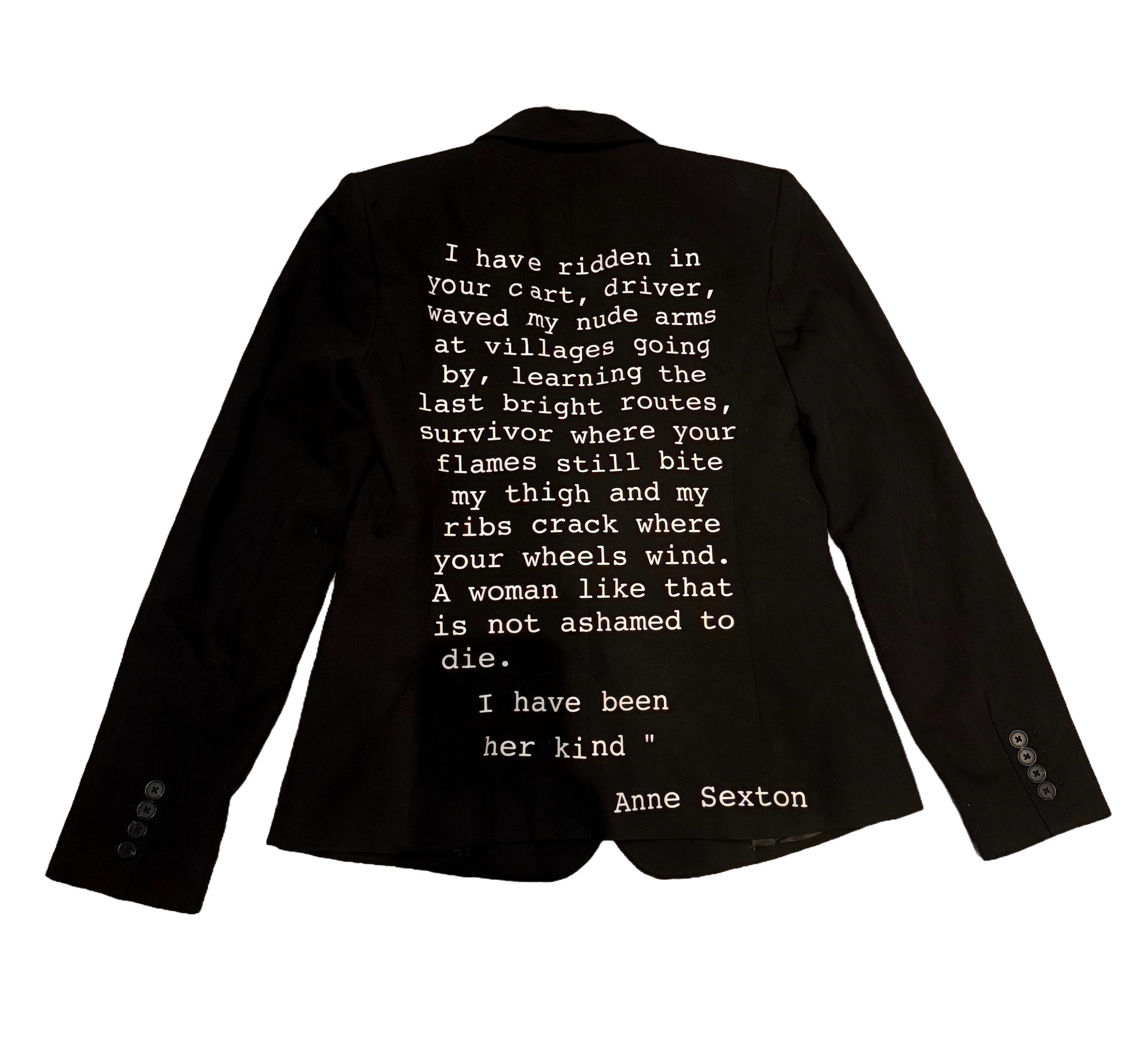 Words from the poem Her Kind by Anne Sextion printed with flexible vinyl on this blazer. Small 6. Chest 34"