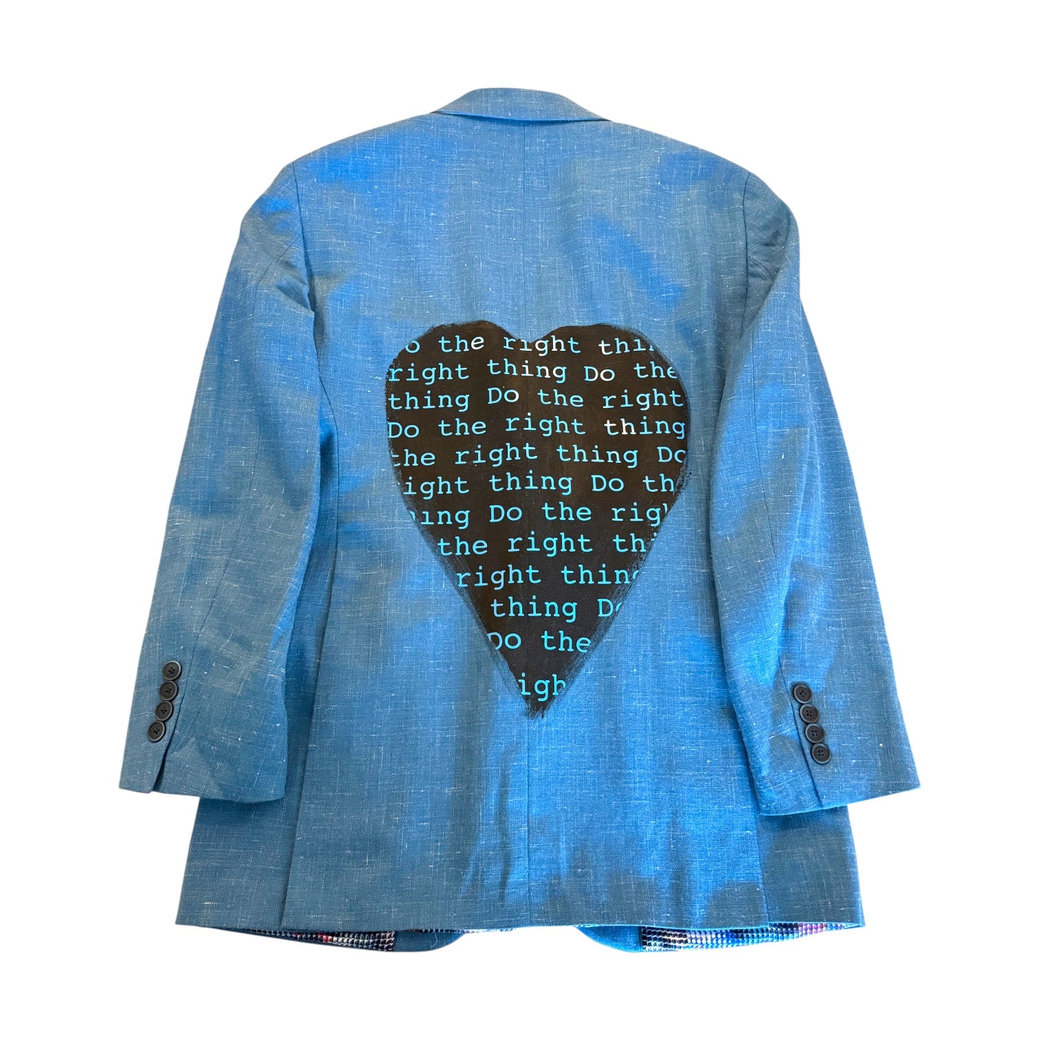 Linen,wool blend blazer in blue with a black heart painted on and vinyl lettering added. Size M.
