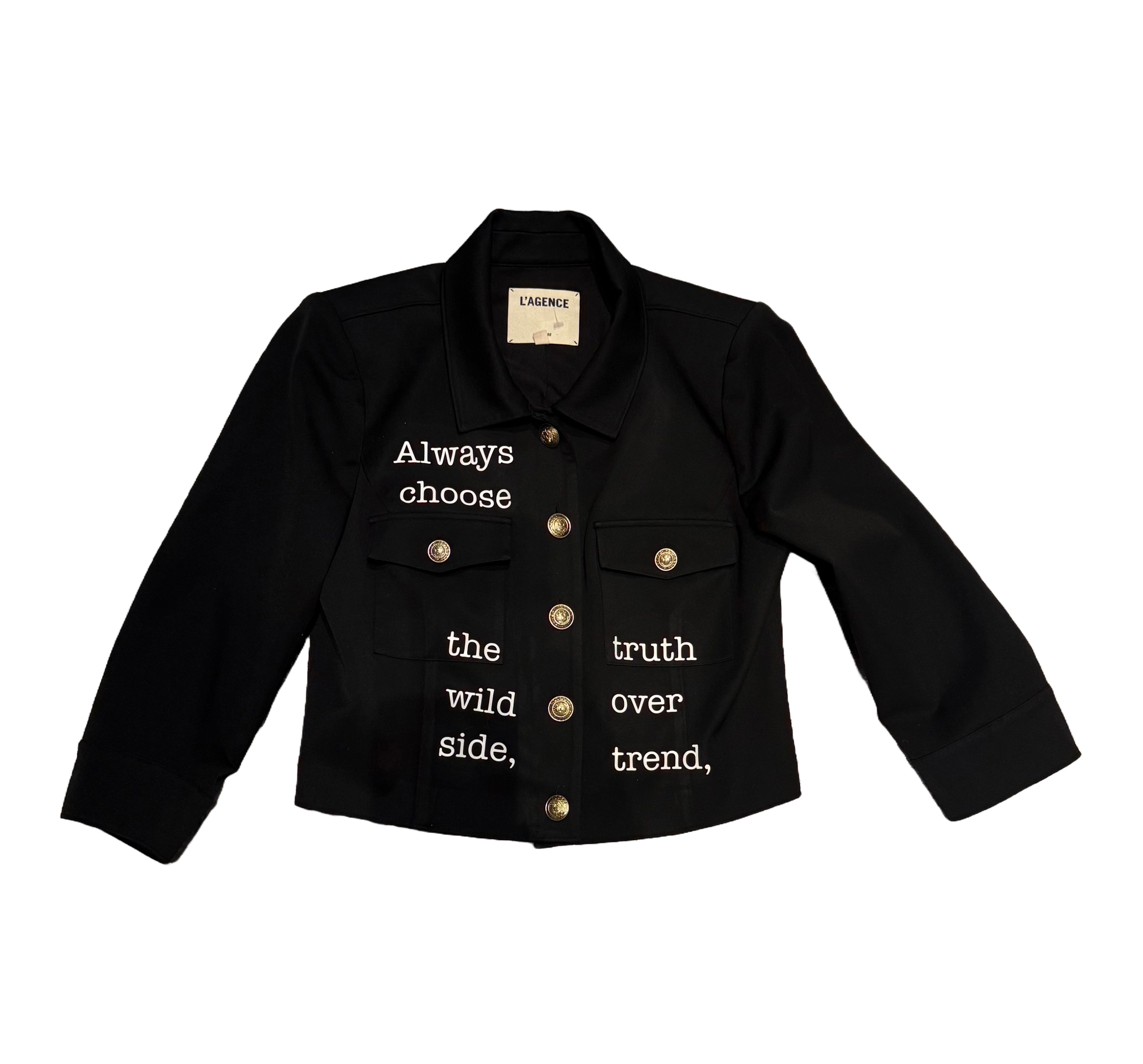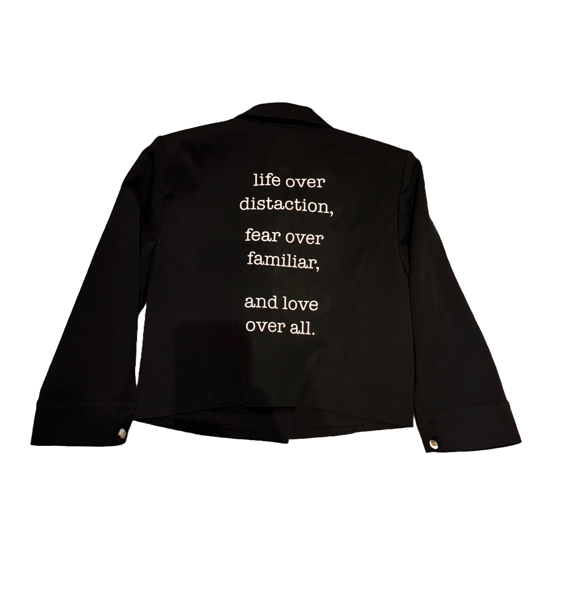 Size 10 Cropped black blazer with gold buttons and two front pockets. Upcycled with vinyl words.
