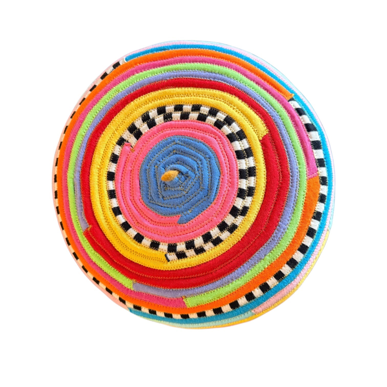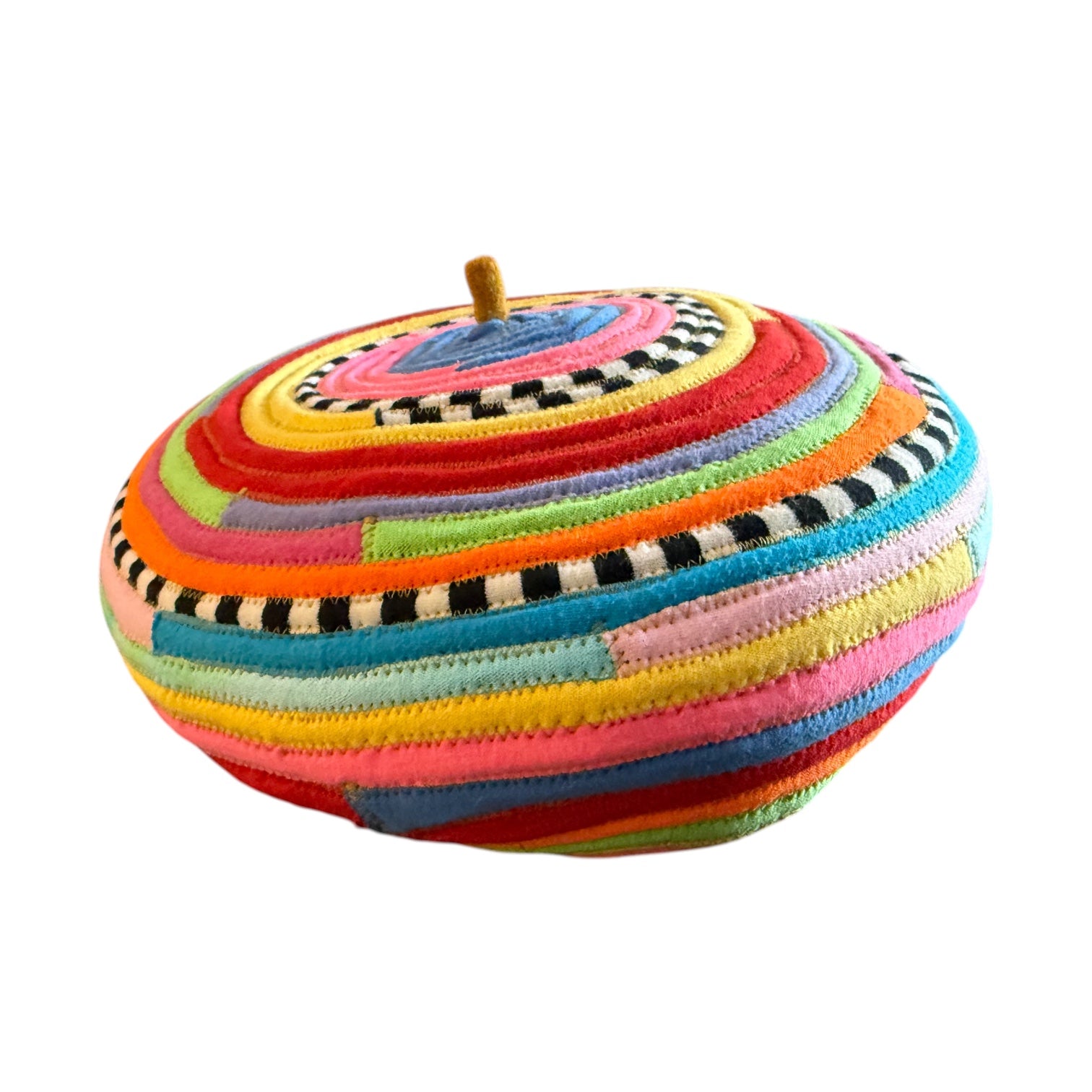 Mustard colored beret with t-shirt strips sewn on in multi-colors. 95% wool, 5% poly. Size M. 22" diameter.