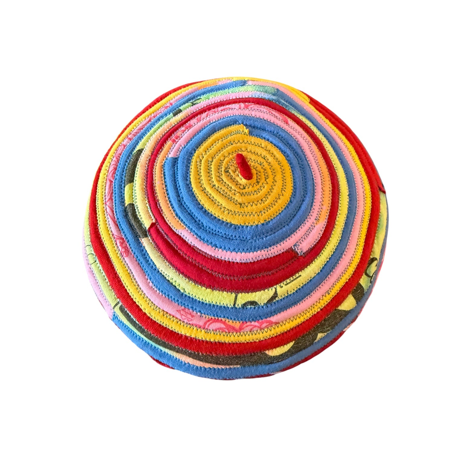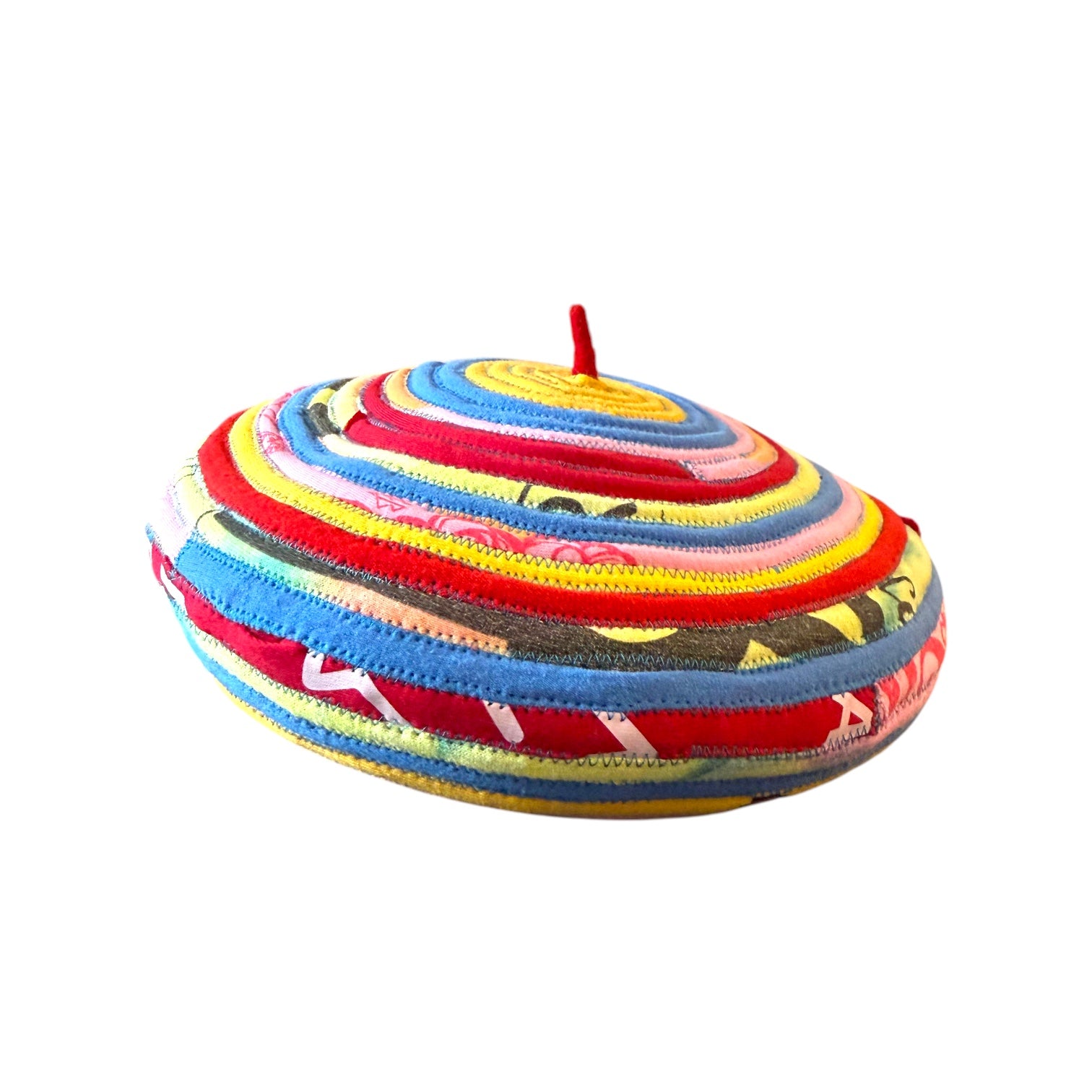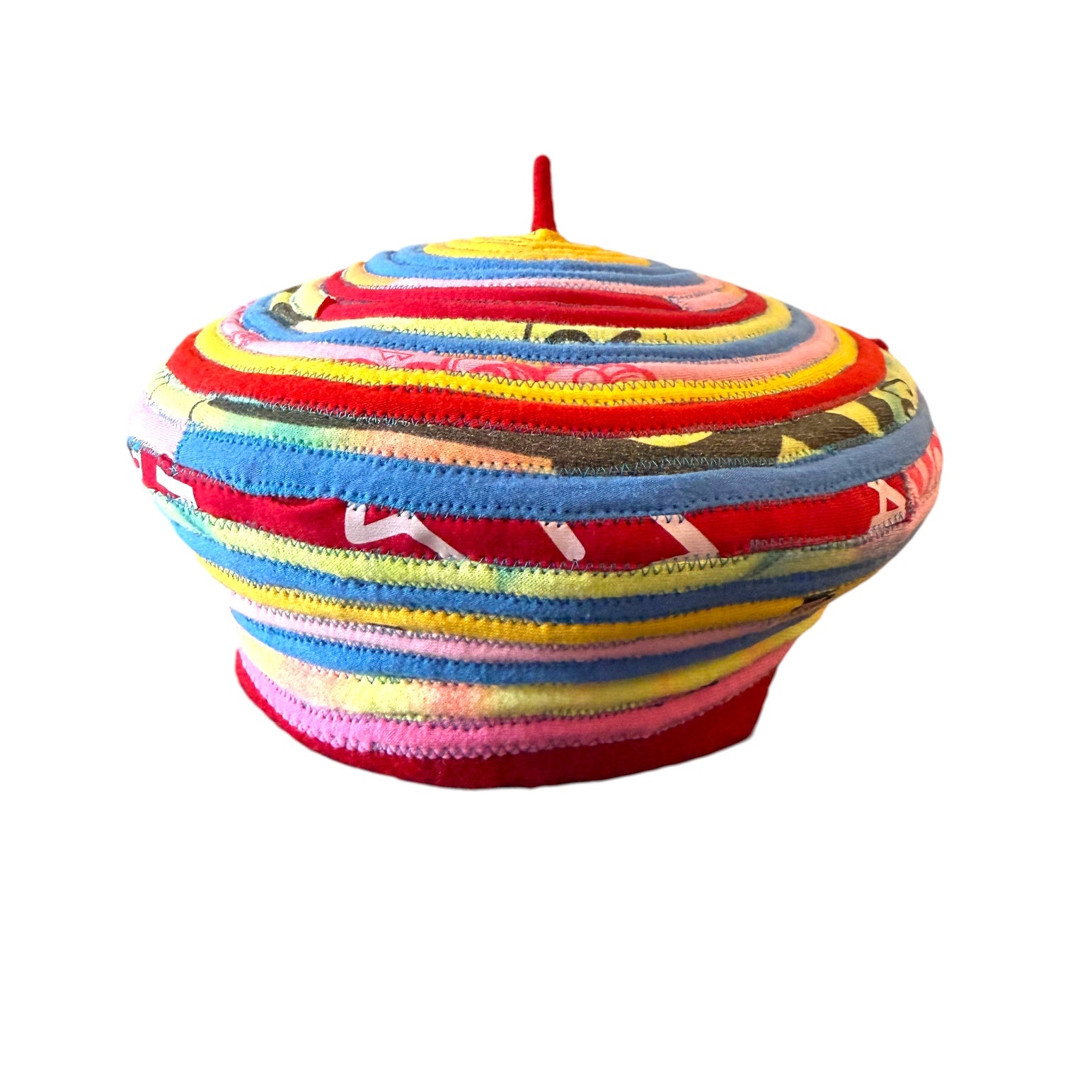 Red Beret with t-shirt strips in multi-colors sewn on. Measures: circmfrence 24.75".